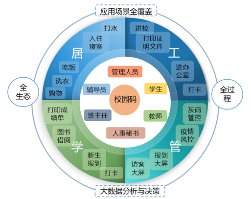 本案例充分利用数字化技术和手段,针对各类人员角色,围绕“居、学、工、管”四大主要场景打造一站式、全过程、一码通的校园生态体系。基于大数据和物联网等新兴技术,设计开发“校园一码通”,探索高校应用管理多场景的系统建设。师生通过一个码,就可以实现迎新报到、居住生活、学习工作、管理决策等,为师生带来全新、高效、安全的数字化体验,创新校园安全科学防疫精密智控,利用大数据驾驶舱,对资源配置进行合理的调整,对风险进行合理的防范,提高校园数字化管理能力和服务水平。