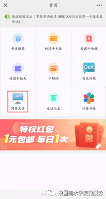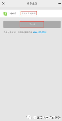 公众号“中国美术学院微服务”-校园卡-网费充值-输入(工号/学号)进行充值