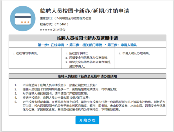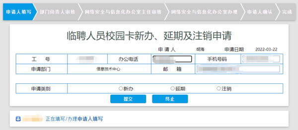 临聘人员需要使用校园卡的,人员所属部门可以通过企业微信——办事大厅——服务中心——临聘人员校园卡新办/延期/注销申请来办理相应功能