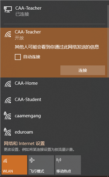 教学区无线上网:连接上CAA-Teacher后就可使用,账号:工号 密码:身份证后六位