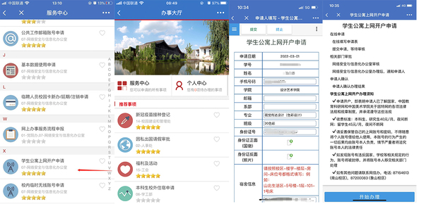 学生公寓网络开户:钉钉--国美钉--学在国美--师生公寓上网开户申请(企业微信--学生事务--学生公寓上网开户申请
