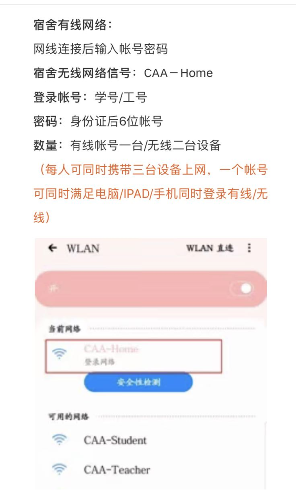教学区免费学生WIFI全覆盖,无线名称:caa-student 账号:学号 密码:身份证后六位